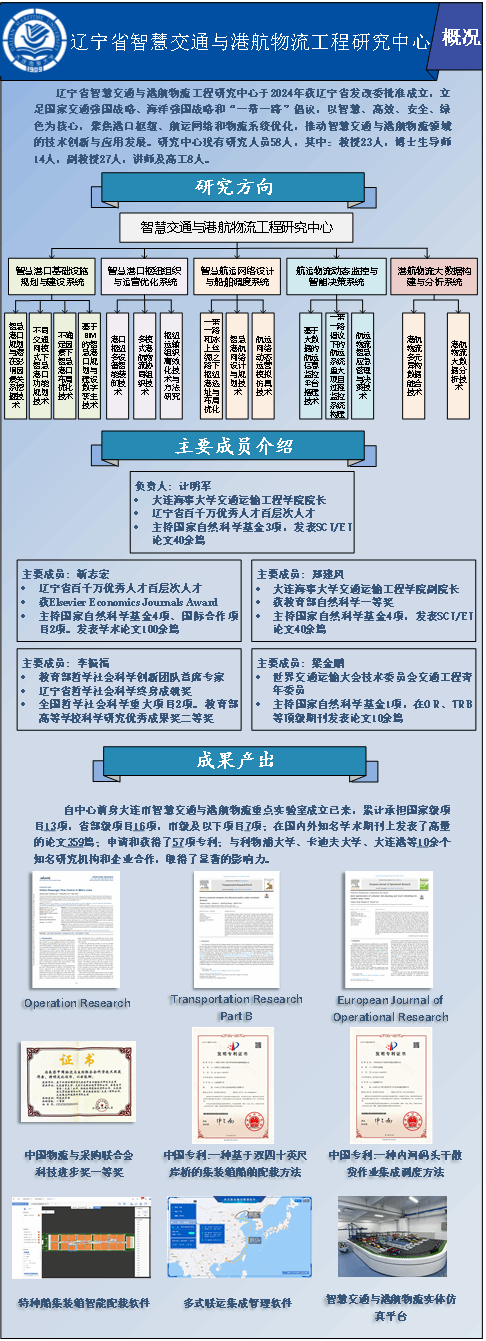辽宁省智慧交通与港航物流工程研究中心(简称研究中心)由辽宁省发改委于2024年1月16日批准设立。核心依托是大连市科技局于2019年正式批准立项的大连市智慧交通与港航物流重点实验室。