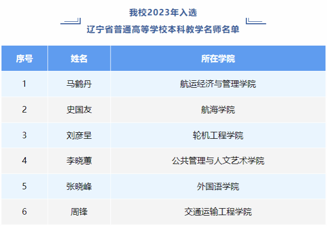 近日,辽宁省教育厅发布《关于公布2023年辽宁省普通高等学校本科教学名师遴选结果的通知》(辽教通〔2024〕56号)、《关于认定第二批国家级一流本科课程第一负责人为普通高等学校本科教学名师的通知》(辽教通〔2024〕55号),我校共14名教师入选,其中学校推荐的马鹤丹等6名老师全部获评教学名师,第二批国家级一流本科课程第一负责人马明飞等8位教师被认定为辽宁省本科教学名师。