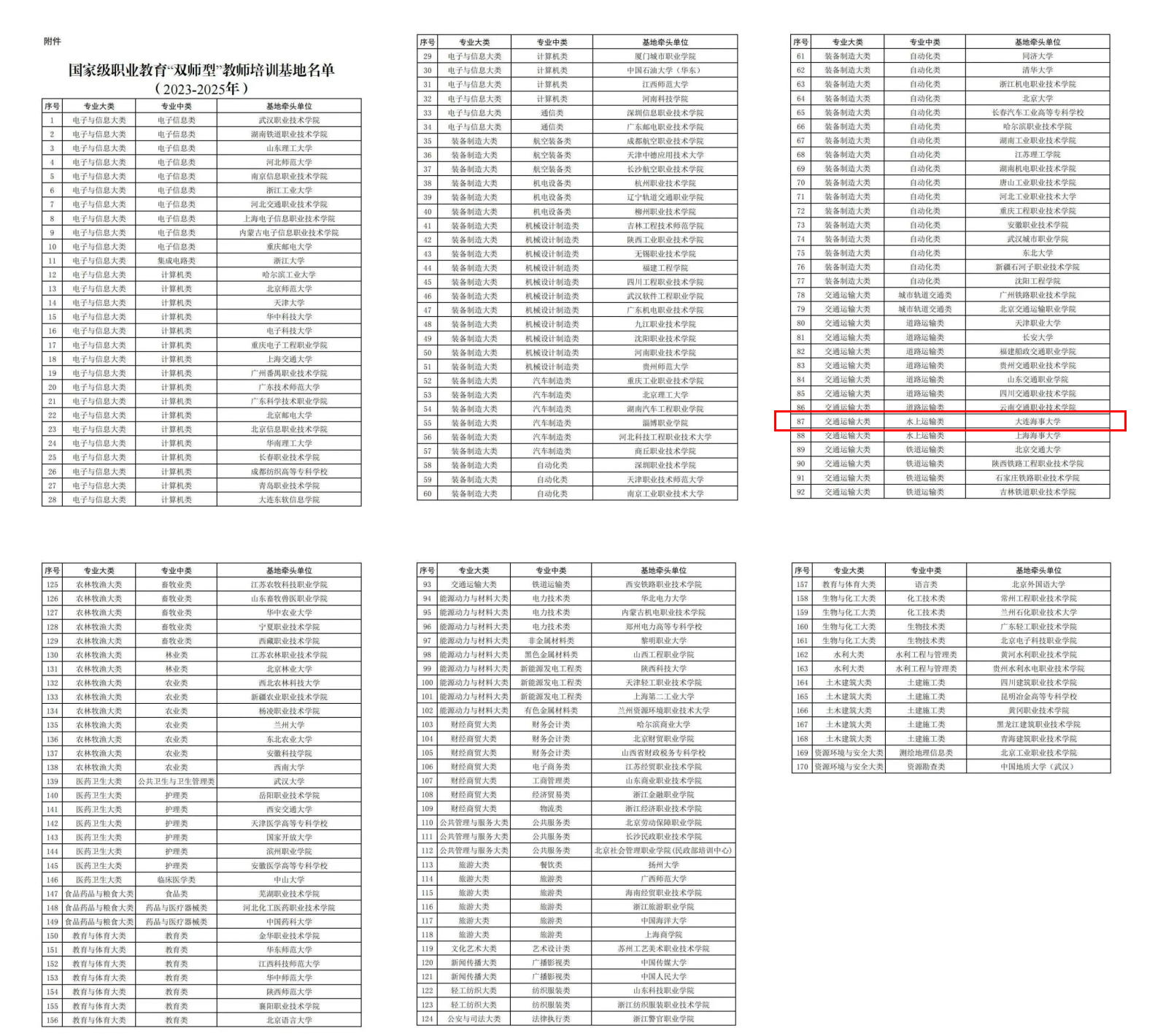 近日,教育部办公厅印发《关于公布国家级职业教育“双师型”教师培训基地(2023-2025年)的通知》(教师厅函〔2022〕28号),共有包括清华大学、北京大学、浙江大学、同济大学等170所院校入选。我校成功入选国家级职业教育“双师型”教师培训基地(交通运输大类)。