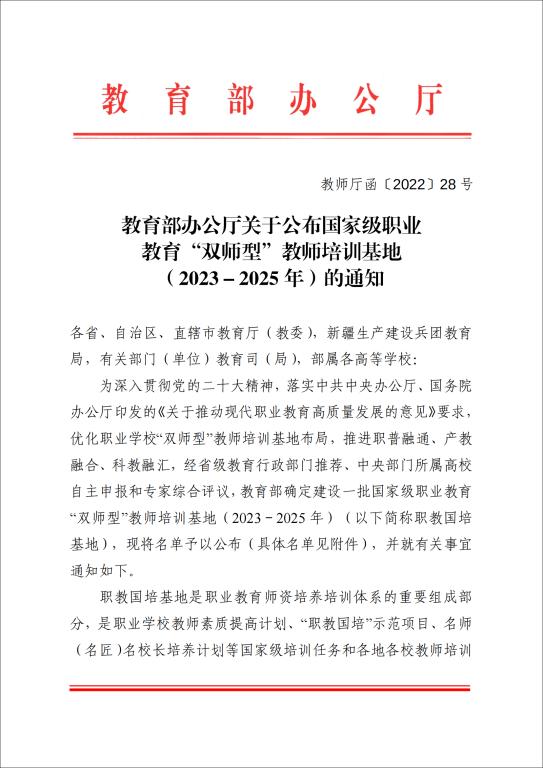 为深入贯彻党的二十大精神,落实中共中央办公厅、国务院办公厅印发的《关于推动现代职业教育高质量发展的意见》要求,优化职业学校“双师型”教师培训基地布局,推进职普融通、产教融合、科教融汇,经高校自主申报、专家委员会评审、主管部门认定推荐、教育部复审等工作流程,面向全国高校遴选、认定了本批次国家级职业教育“双师型”教师培训基地(2023-2025年)。