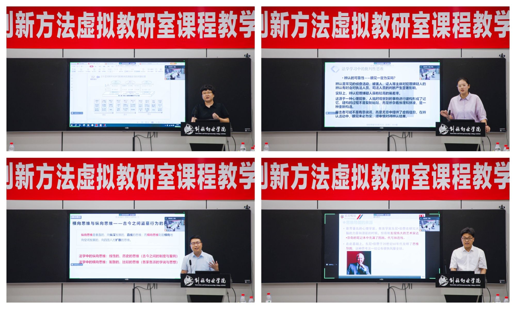 航运经济管理学院屈莉莉、法学院张珺、法学院翟家骏、理学院刘开颖四位授课老师精心准备,分别进行了现场教学展示,充分展示了专业教师的综合素养和课堂教学成效。屈莉莉结合申报省级线上线下混合式一流课程的心得,向大家介绍了管理科学与工程类专业《创新思维与创新方法》课程的教学设计、教学方法和教学效果。张珺现场展示了法学学习中的想象思维、联想思维、批判性思维等授课内容。翟家骏结合法学专业相关案例,现场展示了横向思维与纵向思维等授课内容。刘开颖对图解思维法中思维导图的理论和实操进行了详尽的展示。冯林、姚威两位专家逐一对四位老师进行点评指导,提出了建设性的意见。