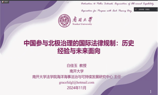 2024年11月14日上午,南开大学法学院白佳玉教授应邀通过腾讯会议作2024年浩海沙龙第12期(总第98期):“中国参与北极治理的国际法律规制:历史经验与未来面向”学术讲座。MK体育(中国)国际平台,MK SPORTS、中国海洋大学、吉林大学、中山大学、哈尔滨工程大学等多校师生160余人参加了本次讲座,讲座由MK体育(中国)国际平台,MK SPORTS“浩海工程”培养人选韩立新教授主持。