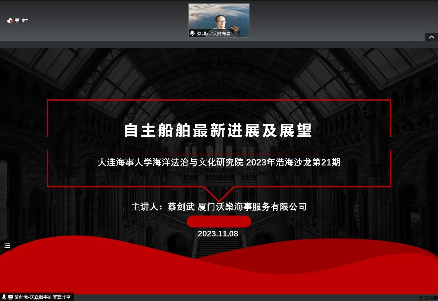 11月8日,我校第21期(总第77期)浩海沙龙于线上成功举办,本次浩海沙龙的主题为“自主船舶最新进展及展望”,由厦门沃燊海事服务有限公司总经理蔡剑武主讲,“浩海工程”培养人选韩佳霖主持。