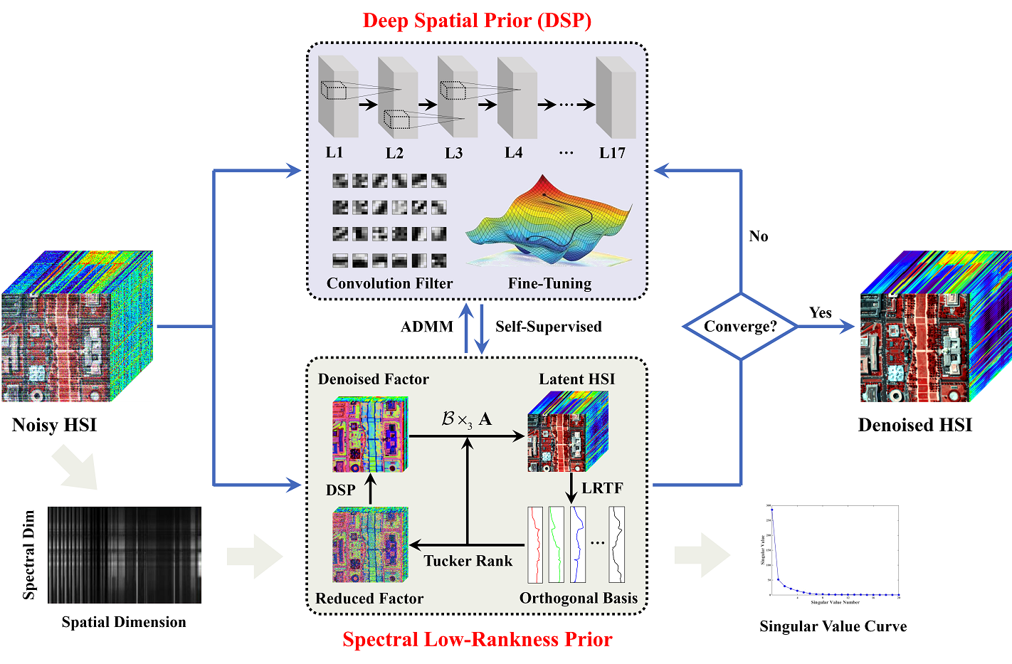 该成果同时引入了光谱低秩先验和深度空间先验,提出了一种自监督高光谱影像去噪方法。该方法既可以充分挖掘高光谱影像内在的张量低秩性,又可以利用深度网络的空间特征表达能力。在没有干净的高光谱影像训练样本的情况下,构建了交替迭代自监督优化框架。通过交替迭代自监督优化来求解光谱低秩先验项和深度空间先验项,采用联合交替方向乘子方法和自监督学习机制进行迭代更新。该方法既引入了模型驱动框架的可解释性,又继承了数据驱动框架的高效性,能够实现复杂场景下的高光谱影像稳健去噪,较大程度上解决了现有大多数高光谱去噪方法的过拟合问题。