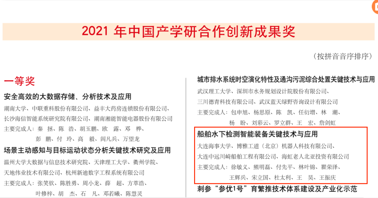 “船舶水下检测智能装备关键技术与应用”围绕船舶水下检测装备机电一体化结构设计、水下高清全景成像与目标识别、基于水下环境感知及多传感器信息融合的闭环控制三大共性关键技术开展产学研协同攻关,实现了船舶水下高效率、高精度、高稳定性检测。项目成果已取得了多项技术突破,形成了具有自主知识产权的船舶水下检测机器人,获得国家发明专利7项,国家实用新型专利17项,在国内外期刊和国际会议上发表相关研究论文20余篇。项目成果已在多家行业龙头企业实际推广应用,取得了显著的经济和社会效益,有效地推进了船舶检测行业的技术创新。