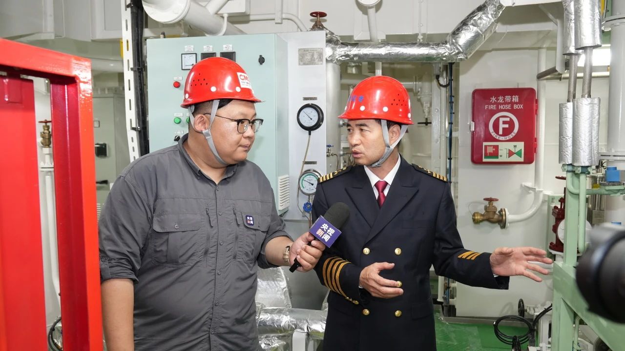 “新红专”轮轮机长张存有教授介绍机舱情况。机舱由四个舱室组成,辅助设备舱主要布置供全船生活、安全、防污染的设备及系统。主机舱安装3台1520kW发电机组,供全船电力和动力用电。配电板间的电站管理系统实现全船用电设备智能化管理。主推进舱配有2台1500kW全回转吊舱推进器。全船动力设备配备智能传感器,可对设备健康状态进行评估和预测,使系统运行更安全、可靠、节能、环保。