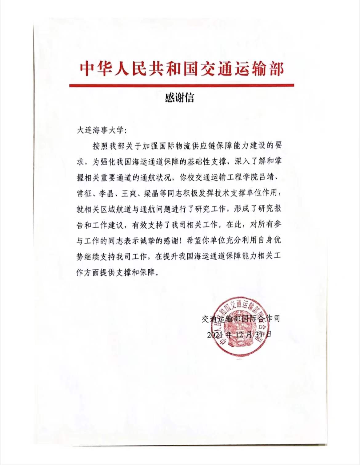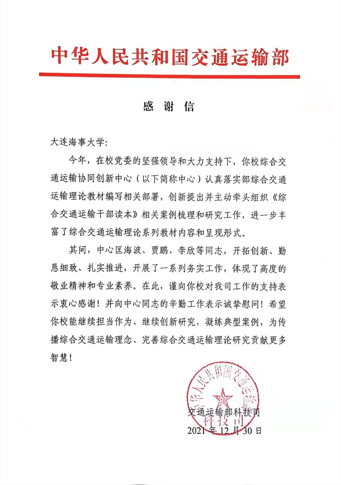 在感谢信中,部科技司、国际合作司分别向我校相关团队、平台和个人发来感谢信,对综合交通运输协同创新中心及其相关团队,对弓永军、匡海波、吕靖、贾鹏、李晶、李欣、常征、王爽、梁晶等同志在相关领域的工作付出表示诚挚感谢。