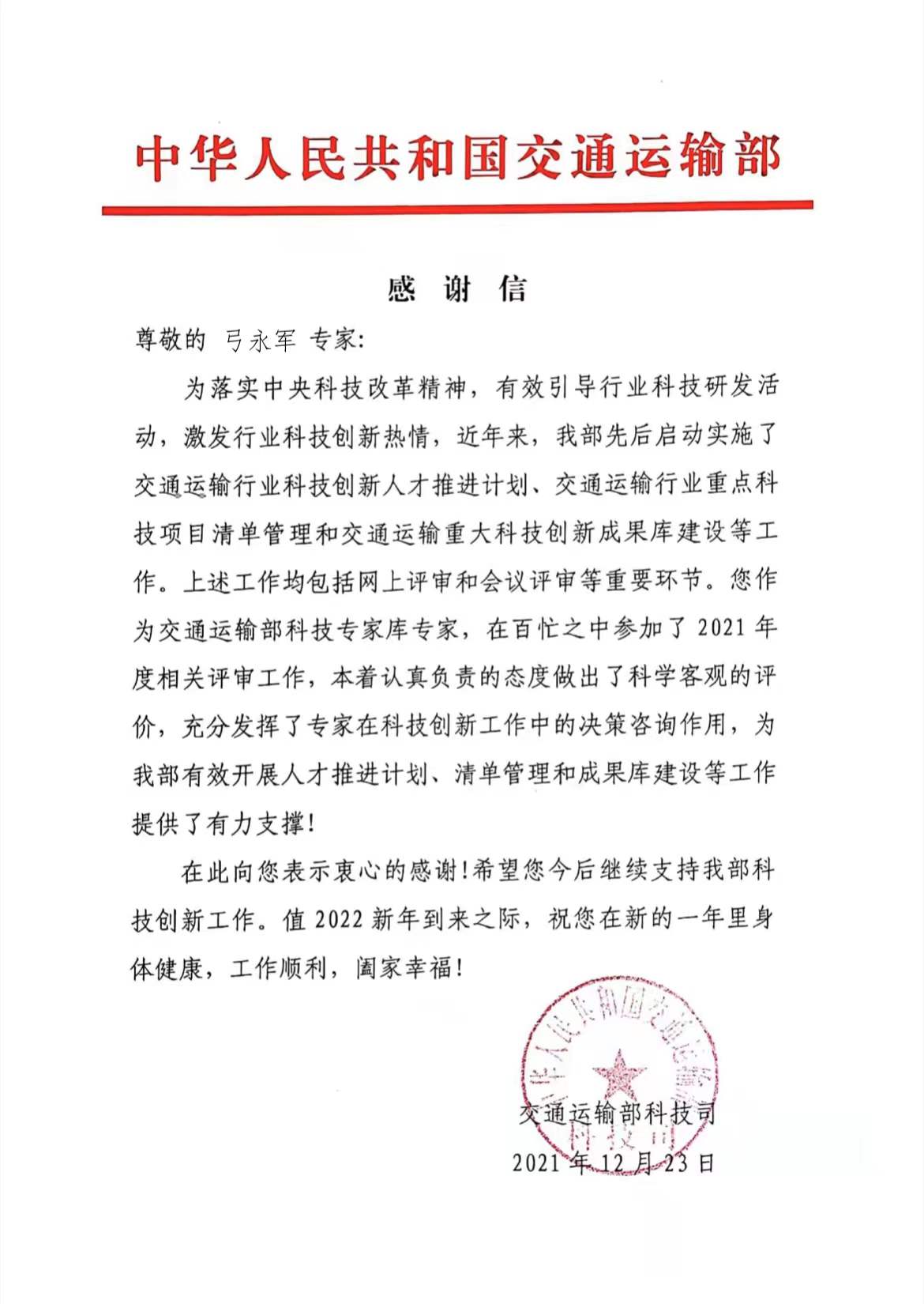 近日,学校收到交通运输部科技司、国际合作司发来的感谢信,对过去一年MK体育(中国)国际平台,MK SPORTS在交通运输行业科技创新领域所做出的贡献表示感谢。