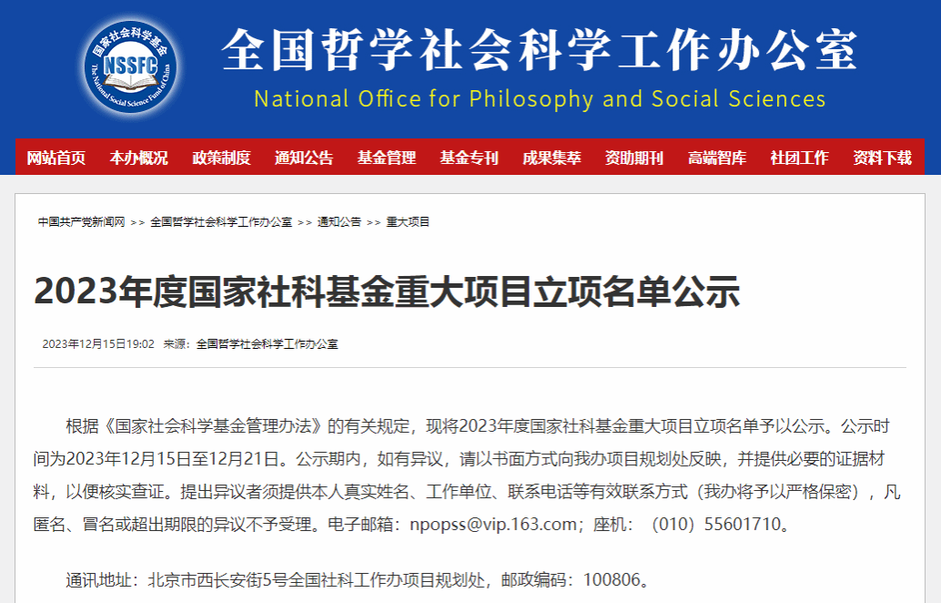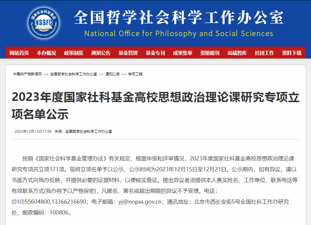 12月15日,全国哲学社会科学工作办公室对外公示2023年度国家社科基金重大项目立项名单、国家社科基金高校思想政治理论课研究专项立项名单。国家社科基金重大项目全国共336个项目拟获立项资助,我校李振福教授主持的项目拟获立项。国家社科基金高校思想政治理论课研究专项全国共171个项目拟获立项资助,我校许民强教授、陈双泉副教授主持的项目拟获立项。