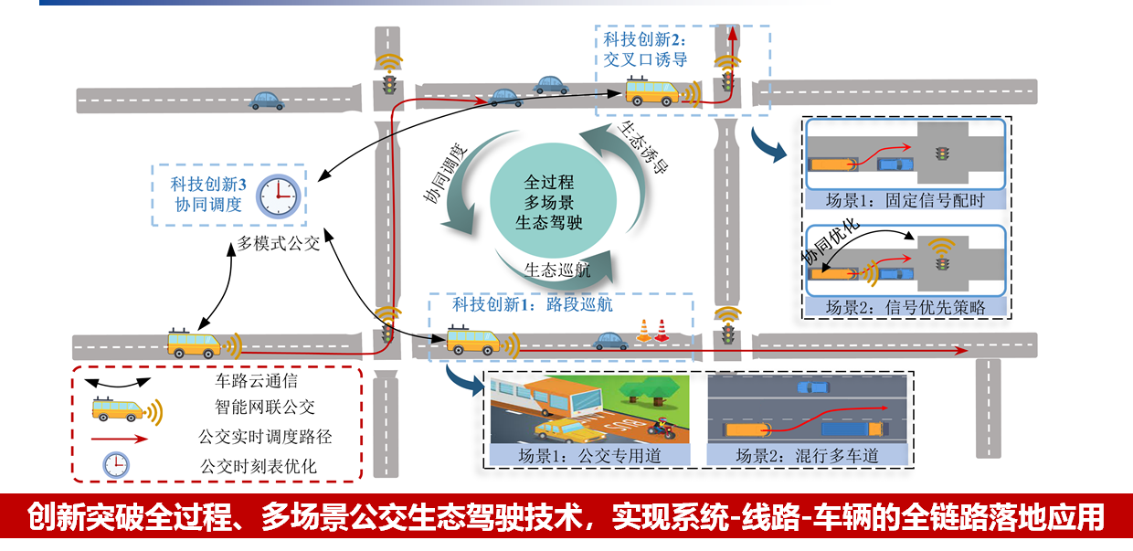 该成果积极响应国家“双碳”战略目标,针对大运量城市公共交通系统“高能耗”的现实问题,通过智能网联环境支撑的生态巡航、生态诱导、生态调度,提高了公交系统生态性、效率性以及服务水平,有助于推动公交系统绿色低碳转型,对于推动公交系统智能化、精准化发展具有重要意义。经行业专家评价,成果核心技术“在基于车辆动力学模型的公交车生态驾驶控制方面达到国际领先水平”,属于“智慧城市+智能网联”双智发展战略的重要标志性成果。