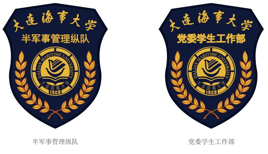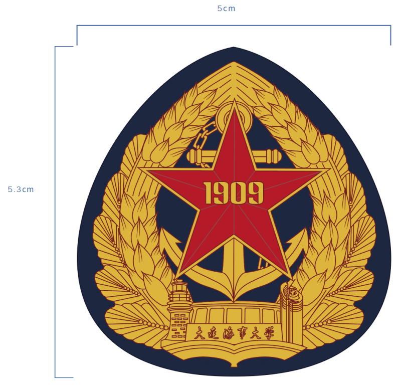 寓意:承载56颗麦穗的海大巨轮,书页/海浪造型和藏蓝色底托,象征海大纳56个民族青年才俊在知识的海洋中探索、领航。中心处船锚和五角星造型,象征着海大坚定不移践行为党育人、为国育才的初心,五星中间的1909代表学校创办年份,增添了帽徽的历史厚重感(五星中间的DMU代表学校英文名称,丰富了帽徽中英文元素)。学校标志性建筑融入帽徽,代表着海大学子的荣耀和对学校的归属。外围由松枝环绕,象征海大事业平稳持久、蒸蒸日上。