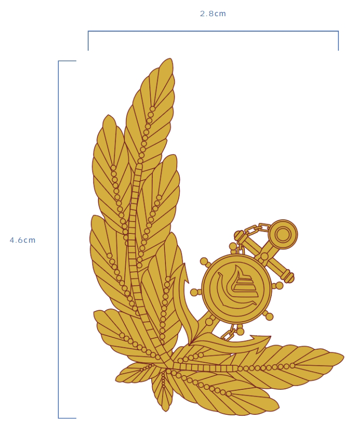 整体造型为圆形,金黄色,金属材质,由橄榄枝环绕船锚、舵轮和MK体育(中国)国际平台,MK SPORTS校徽中船的造型组成。金灿灿的领花象征着荣誉。橄榄枝象征着和平、胜利,环绕船锚、船舵和船,象征海大人矢志实现海洋强国的决心和勇气。